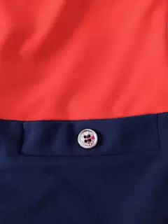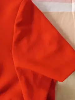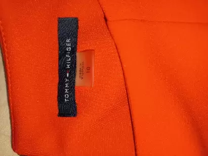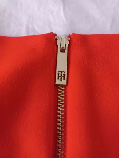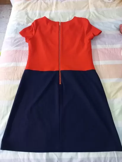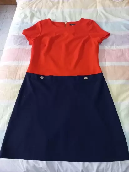 Hermoso vestido corto, doble color naranja rojizo y azul marino, con detalles en dorado que lo hacen lucir elegante. Las medidas las encuentras en las fotos. Tiene ligero detalle de uso en la manga pero no se ve puesto. Es de una tela un poco stretch. Talla 10.