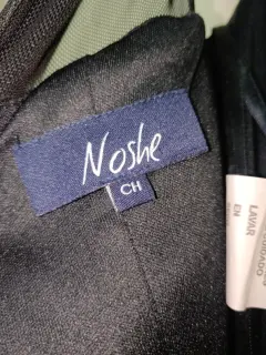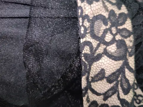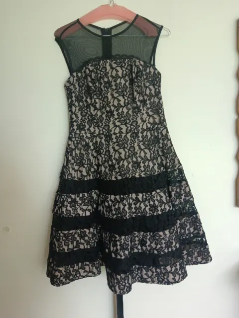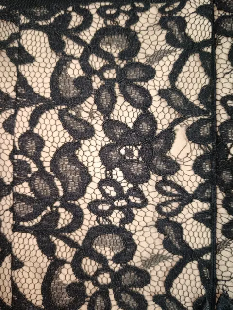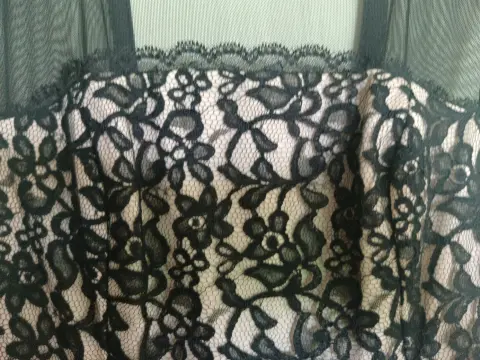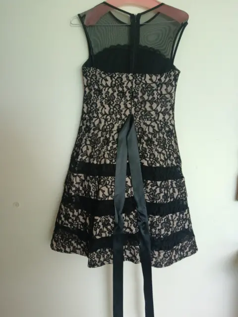 Vestido corto color beige con encaje negro y listón en la parte posterior cuenta con unas tinas telas enmallada es parte de hombros y varilla en parte de cintura
