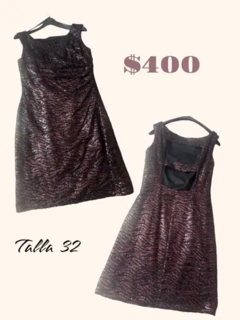 Lentejuela de color cobre, pliegue en cintura junto con el cierre, escote en espalda muy lindo, tiene forro en buenas condiciones y no tiene detalle en la lentejuela.