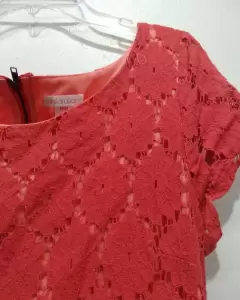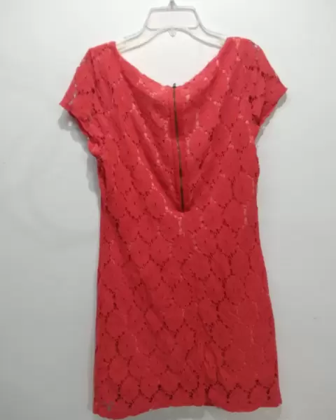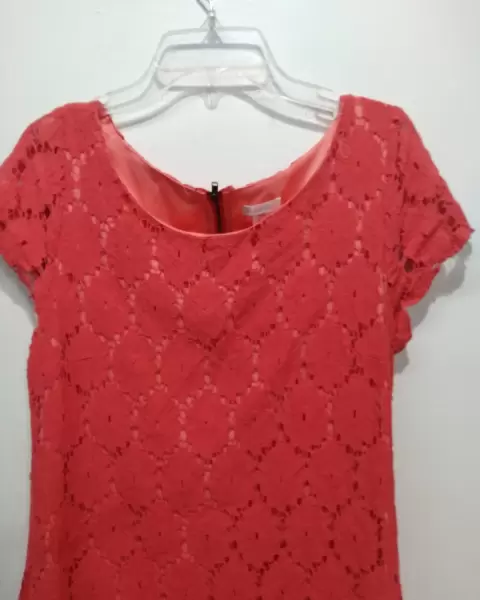 Vestido corto, color coral, medio cierre por la parte trasera, tela tipo encaje, manga corta, cuello redondo