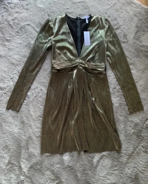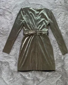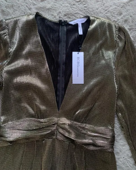 Vestido corto con escote en V. Metálico. Marca BCBGeneration. Talla 6 (S). Sin detalles.