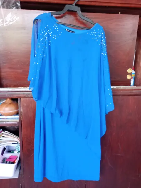 Vestido corto de fiesta. Vestido de fiesta talla mediana corto a la rodilla con capa con brillos tela de chifon