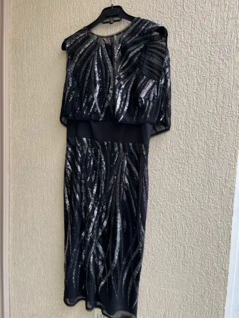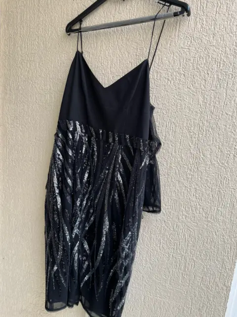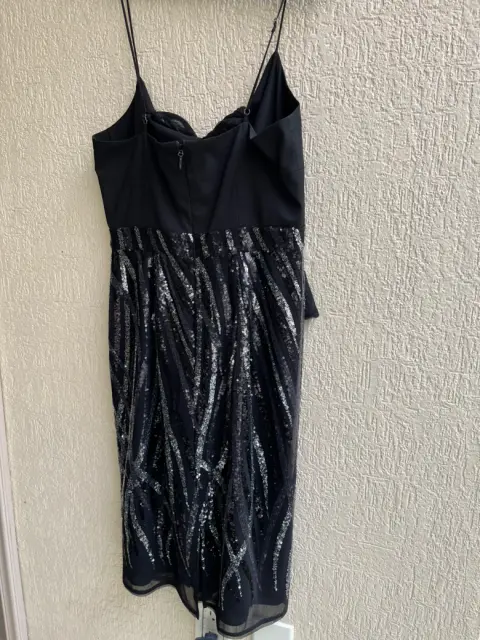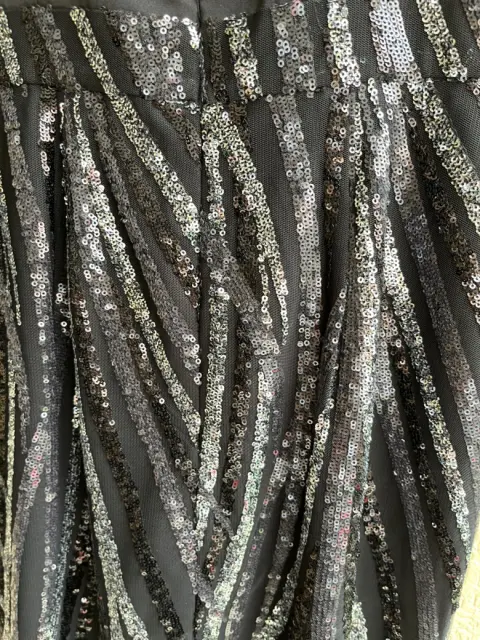 Vestido corto de fiesta. Color negro con lentejuela con diseño, la lentejuela color negro y plata medidas largo 91cms, ancho 74 cms, busto 92cms, corte recto , de tirantes con top adicional que llega un poco más alto de la cintura , estiliza el cuerpo , con forro