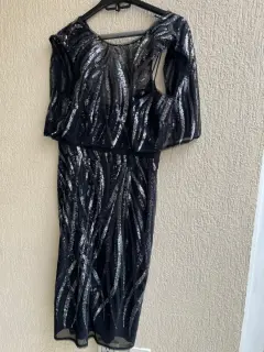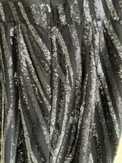 Color negro con lentejuela con diseño, la lentejuela color negro y plata medidas largo 91cms, ancho 74 cms, busto 92cms, corte recto , de tirantes con top adicional que llega un poco más alto de la cintura , estiliza el cuerpo , con forro