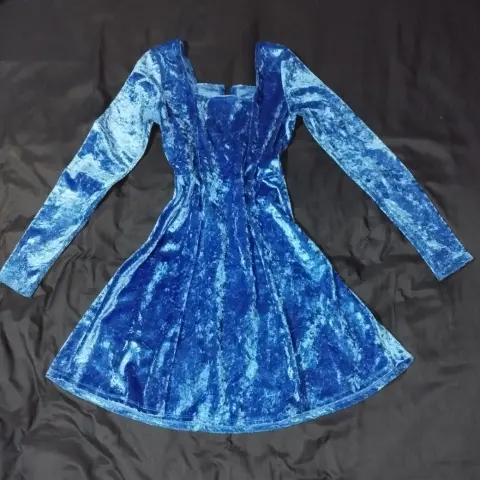Vestido corto de terciopelo azúl brillante. Bonito vestido de terciopelo azúl brillante y suave de manga larga, escote cuadrado, en perfecto estado, sólo se usó una vez, se lava fácil, la tela no pica ni raspa, no transparenta, ajusta al cuerpo ya que estira, es talla M pero está un poco reducido, los accesorios no están incluidos. Haz tu oferta!
