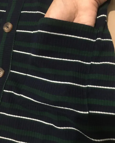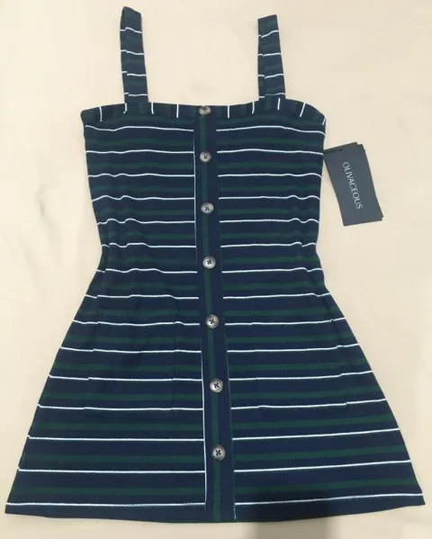 Vestido de tirante corto con rayas verde, azul y blanco talla Ch, con bolsos al frente