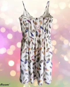 Descripción:Vestido en color blanco con estampado de plumas. Tiene cierre frontal en la parte del busto, resorte en costados y tirantes ajustables.