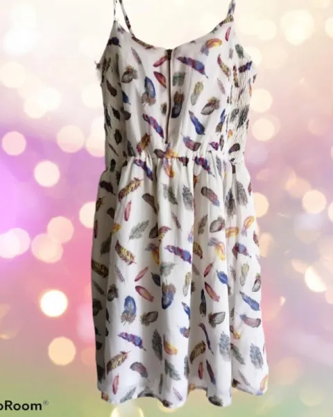 Vestido corto, estampado de plumas. Descripción:Vestido en color blanco con estampado de plumas. Tiene cierre frontal en la parte del busto, resorte en costados y tirantes ajustables.