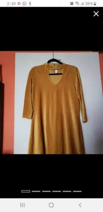 Vestido para tiempo frio/fresco tela gamuza, color mostaza, manga 3/4, escote pequeño parte enfrente, con botones parte del cuello, queda arriba de las rodillas.
