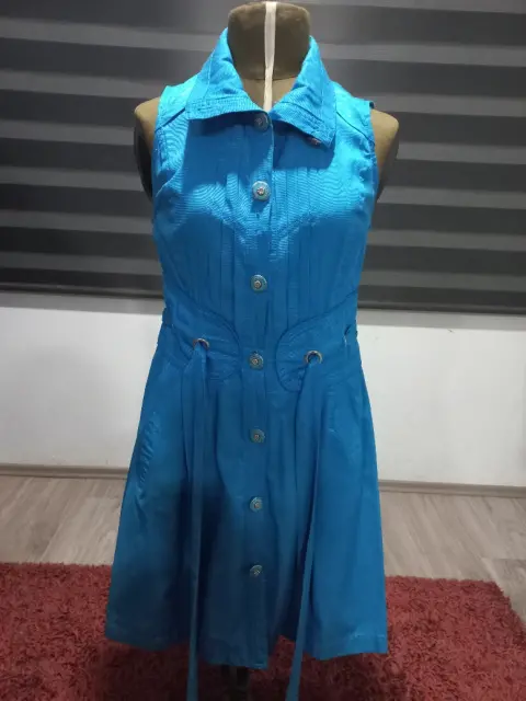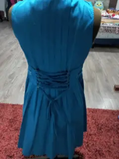 Vestido color azul turquesa con cintas en la espalda baja, talla mediano,sin manga, linea a con tablas grandes.