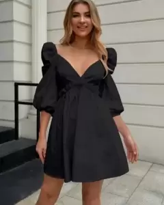 Vestido corto manga larga. Vestido corto Escote en Corazón Manga larga Plegado en la cintura Talla S color negro ( talla L color Lila )
