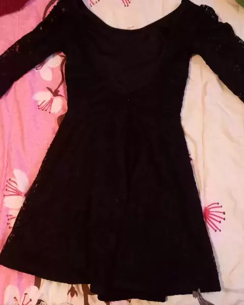Vestido corto color negro de mangas largas, con escote en la parte de la espalda