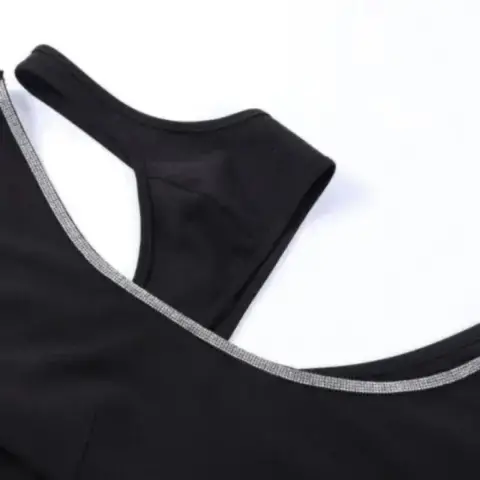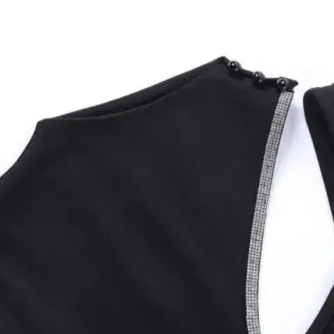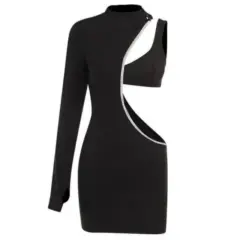 Hermoso vestido negro en una manga con apertura lateral y detalles en cristal en tono plateado