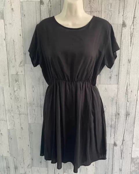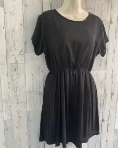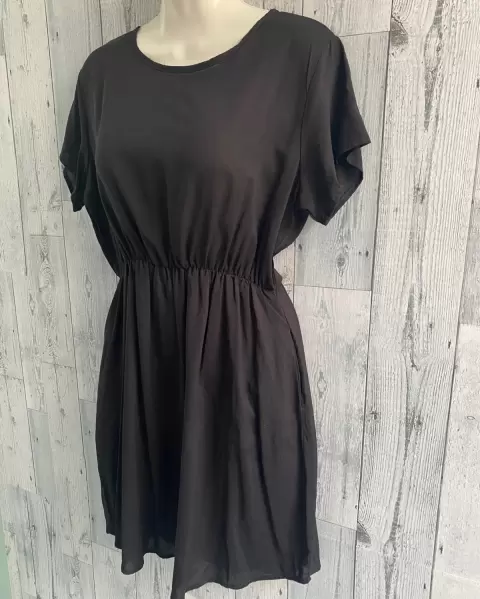 Bonito vestido cortito negro con bolsitas a los costados. El corte tipo imperio disimula la pancita y da buena forma 😉