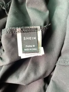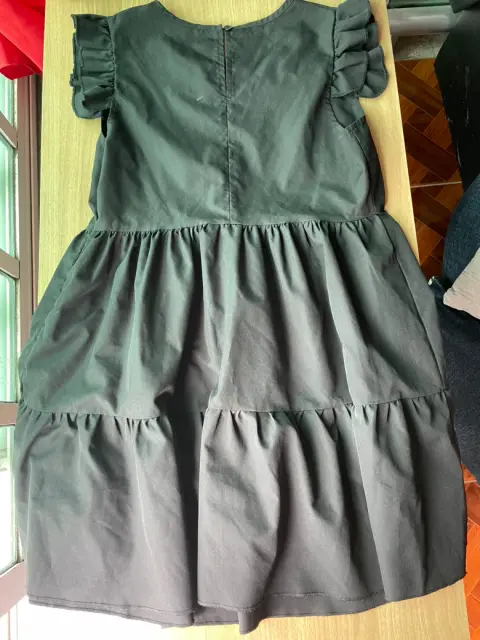 Vestido corto negro, tipo blusón, ajustado de la parte de arriba y suelto de abajo