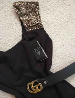 Vestido corto negro Guess. Precioso vestido corto color negro marca Guess , con detalles de lentejuelas cobrizas en los hombros (no incluye el cinto) cierre por la parte de atrás . La tela es gruesa , está muy padre