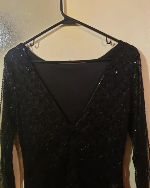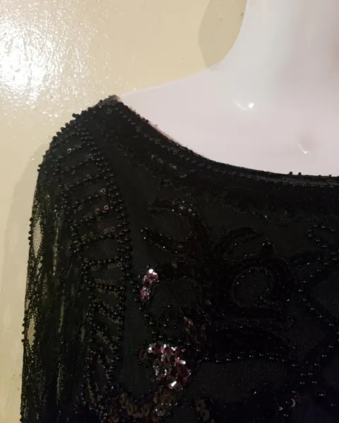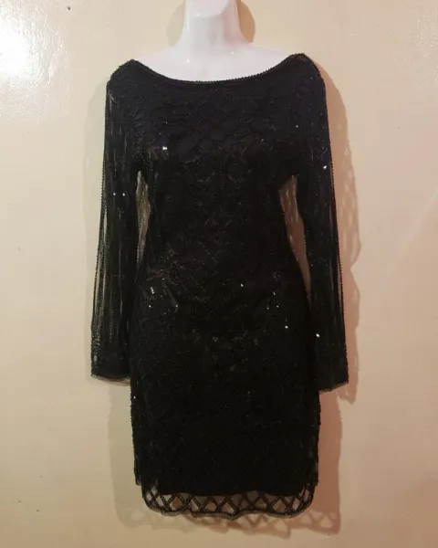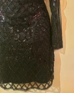 Vestido corto negro lentejuelas. Vestido corto negro chaquiras manga larga transparente