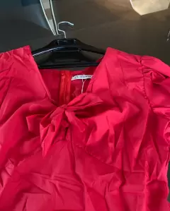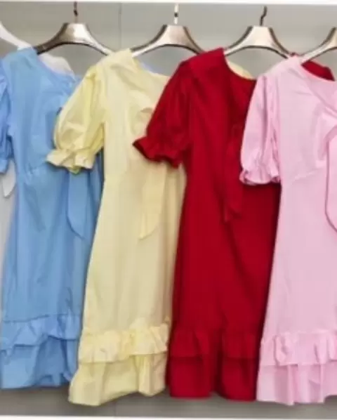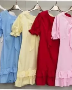 Vestido corto con Olán y moñoManga corta bombacha Tela poliéster y algodón Colores rojo azul amarillo y blanco Tallas S M L