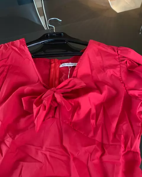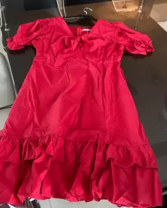Vestido corto Olán. Vestido corto con Olán y moñoManga corta bombacha Tela poliéster y algodón Colores rojo azul amarillo y blanco Tallas S M L