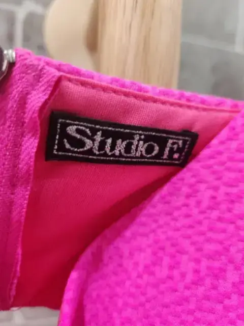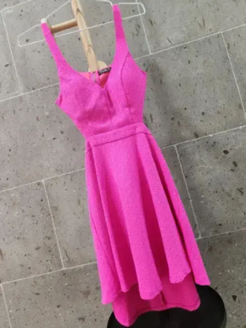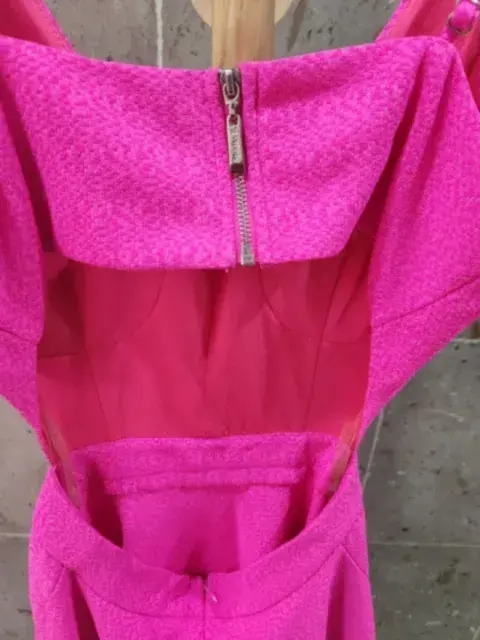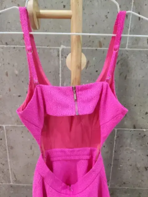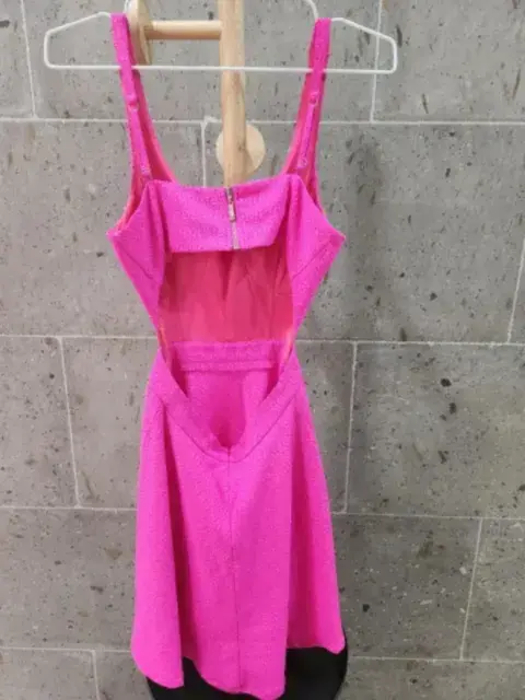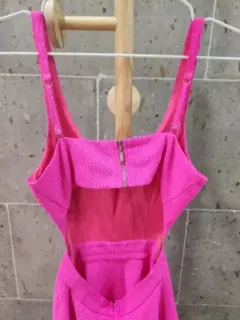 Vestido corto (arriba de la rodilla) color fiusha y con tirantes. Gran parte de la espalda y los laterales (costillas) estan descubiertos. Se sujeta de la parte trasera a la altura de donde se abrocha el bra por medio de un cierre. El color esta increíble y el diseño muy adhoc para tiempos de sol y para eventos en playa.Talla 6