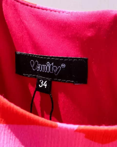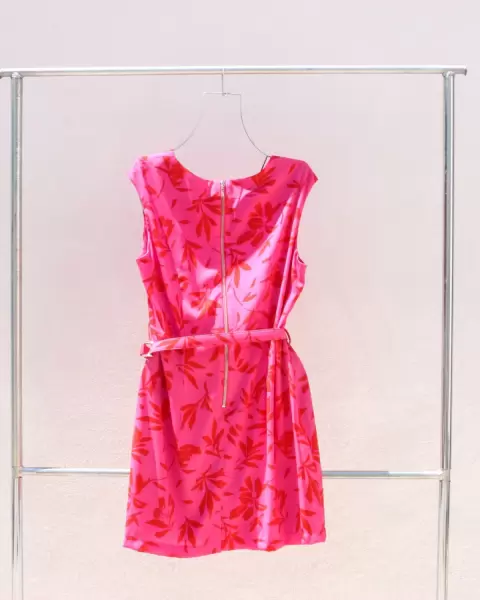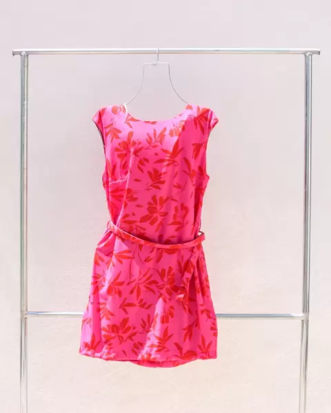 Vestido corto rosa con manga en el hombro y estampado de hojas en rosa más fuerte. Incluye cinturón.