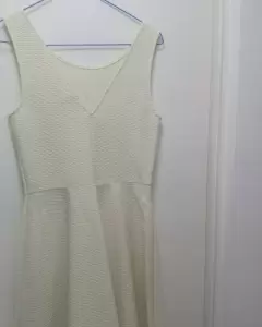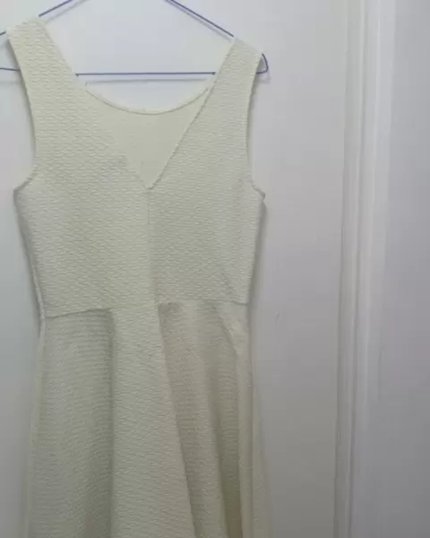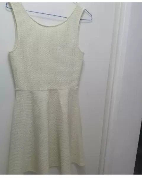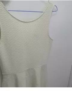 Vestido sin mangas amarillo claro, con textura , corte A .no tiene ningun detalles, se uso como 3 veces . Dice talla 10 pero queda a S a M , estira muy pocoMedidas: cintura :31 cmAxila a axila : 36 cmLargo : 72 cm