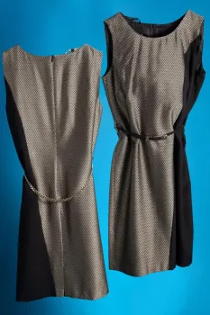 Vestido corto, sin mangas, entallado, formal, dos colores, negro y dorado, entallado, pata de gallo, cierre invisible, Talla 30, fondo integrado, usado muy poco, en buenas condiciones, no incluye cinturón.