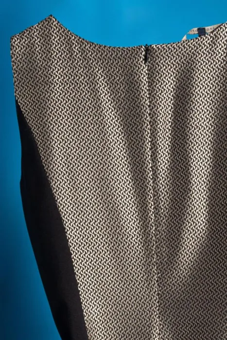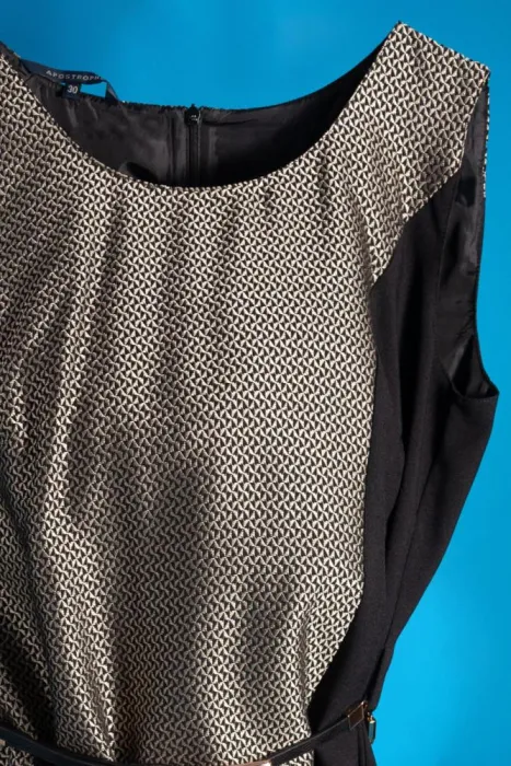Vestido corto sin mangas formal. Vestido corto, sin mangas, entallado, formal, dos colores, negro y dorado, entallado, pata de gallo, cierre invisible, Talla 30, fondo integrado, usado muy poco, en buenas condiciones, no incluye cinturón.