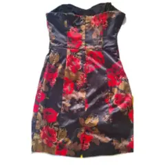 Vestido corto strapless marca Guess, color negro con estampado en rojo y dorado, talla 3, solo se usó una vez y se guardó. Acentúa muy bien la figura, muy bonito.