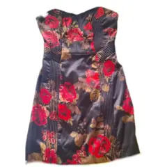 Vestido corto strapless marca Guess. Vestido corto strapless marca Guess, color negro con estampado en rojo y dorado, talla 3, solo se usó una vez y se guardó. Acentúa muy bien la figura, muy bonito.