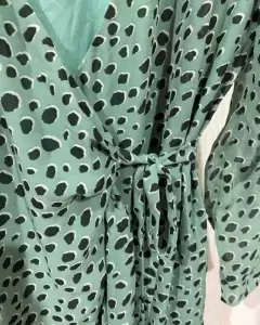 Vestido con print verde, cruzado con amarre en cintura, tiene forro y esta nuevo. Es más opaco, pero la cámara no agarra el color exacto. Esta super lindo pero yo soy muy alta y me queda algo corto