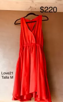 Color coral, la parte de los tirantes es cruzada por detrás, es corto a la altura de las rodillas; tela vaporosa.