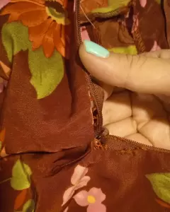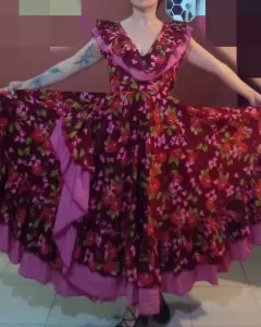 Vestido de estampado floreado con cuello V, sin mangas, olanes bicolor en la parte baja, cuello y lateral, con cierre en la parte posterior, con caida súper bonita y muy comodo para bailar, ✨detalle: descosido del cierre pero muy poquito (ver última foto) Talla 7