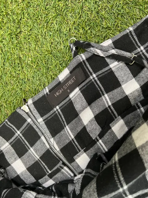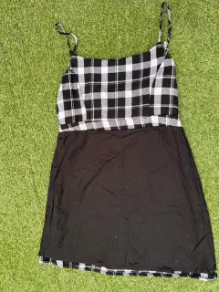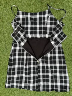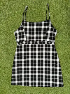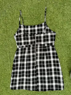 Vestido corto , tela algodón, marca High Street, en color negro con cuadros blancos. Con fondo inferior.