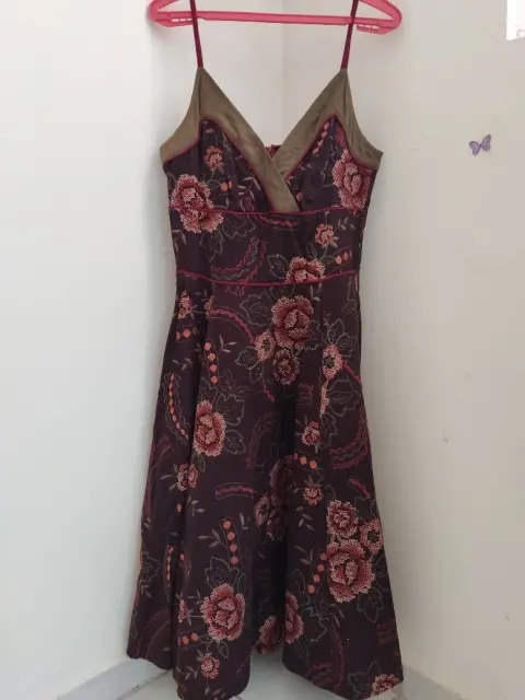 Lindo vestido de cocktail, color café con bordado de punto de cruz, tirantes. Talla chica, lavable en casa.