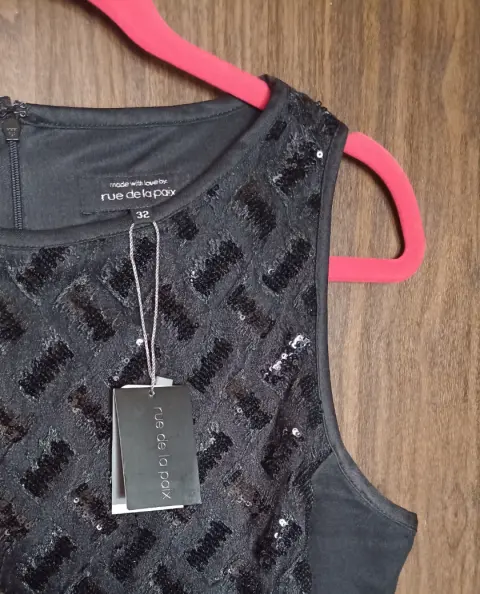 Vestido de cocktail Rue de la Paix. Vestido corto negro sin mangasTalla 32Bordado de lentejuela al frente, con forro completo, cierre invisible y pequeña abertura en la falda por la parte de atras