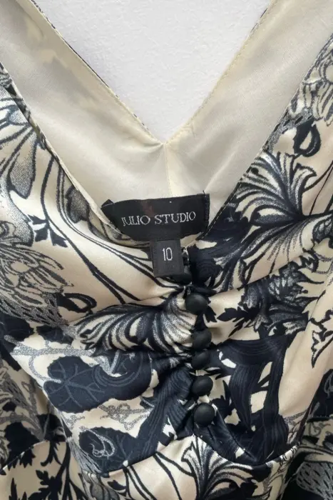 Vestido de coctel, talla 10, marca Julio, excelentes condiciones, color beige con azul marino, largo a la rodilla.
