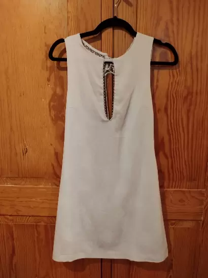 Mini vestido con escote en el pecho y espalda descubierta, detalle de encaje en la parte trasera super lindo mide de axila a axila 44 y de largo 84 la tela es de un gris muy tenue y esta estampada con flores