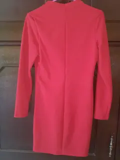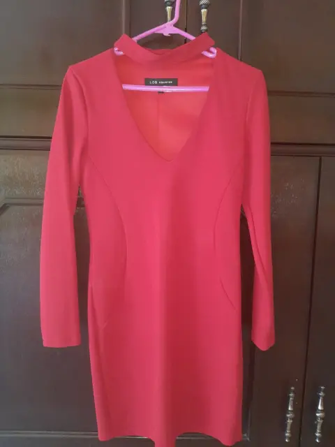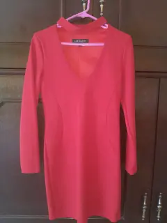 Hermoso vestido rojo de manga larga cuello v. El largo queda arriba de la rodilla y queda pegado al cuerpo.