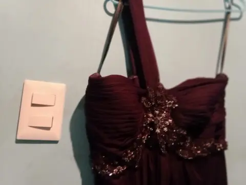 Hermoso vestido corto de coctel color plum talla 10. Tiene un solo tirante y pedrería al frente.