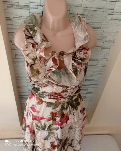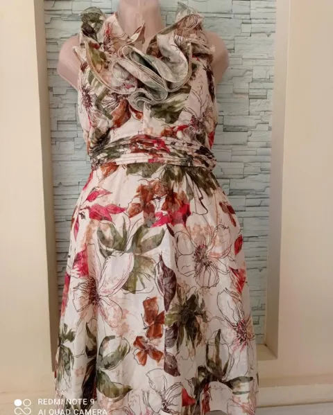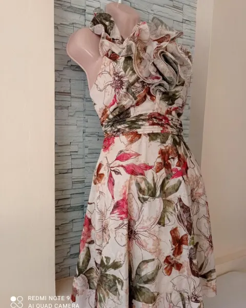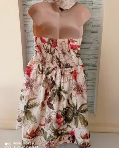 Vestido de cóctel floreado. Vestido de cóctel floreado de algodón con forro y cuello Halte, elástico en la espalda y copas