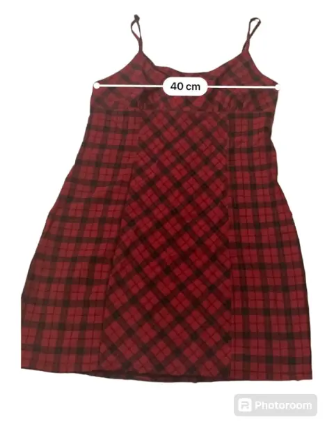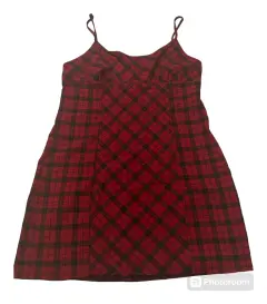 Vestido de cuadros. Vestido corto de cuadros, rojo con negro y una línea gris, tela 73% rayón, 24% poliéster y 3% spandex, estira, no trasparenta.