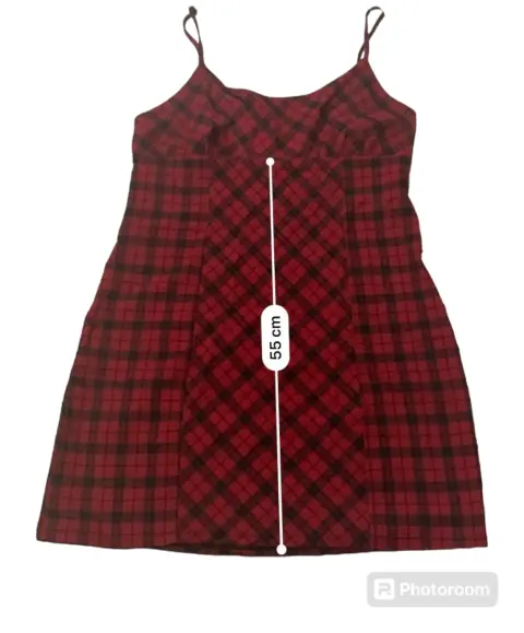 Vestido corto de cuadros, rojo con negro y una línea gris, tela 73% rayón, 24% poliéster y 3% spandex, estira, no trasparenta.