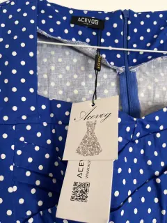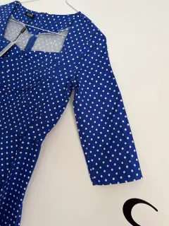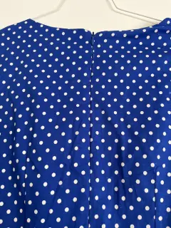 Vestido azul con puntos blancos, talla mediana, corte A, manga tres cuartos, largo a la rodilla