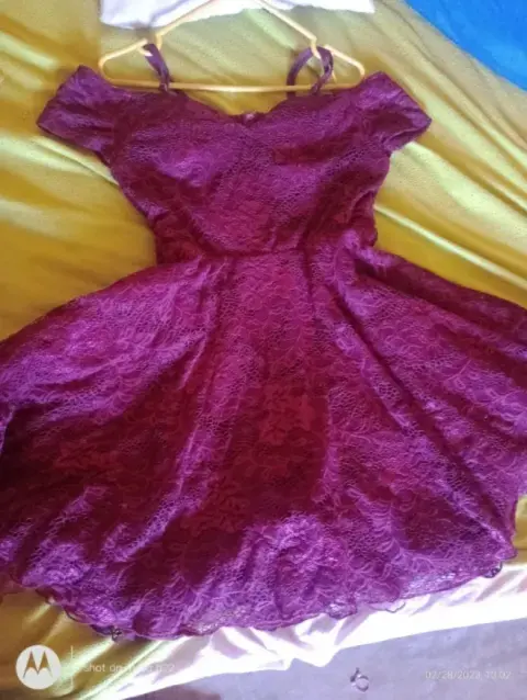 Vestido de dama elegante tipo princesa. Vestido de encaje Sólo se uso una vez.Es color vinoTela suave: 8% eslastano y 92% naylonTrae forro (para q esponje)Vestido corto arriba de las rodillasTrae tirantesVestido juvenil tipo princesaMarca Just BlackQuedaría perfecto con un cinturon para q luzca cintura. ☺️La tela es suave y no estira mucho.Es un vestido de excelente calidad 💎💯 garantizada. Talla grande