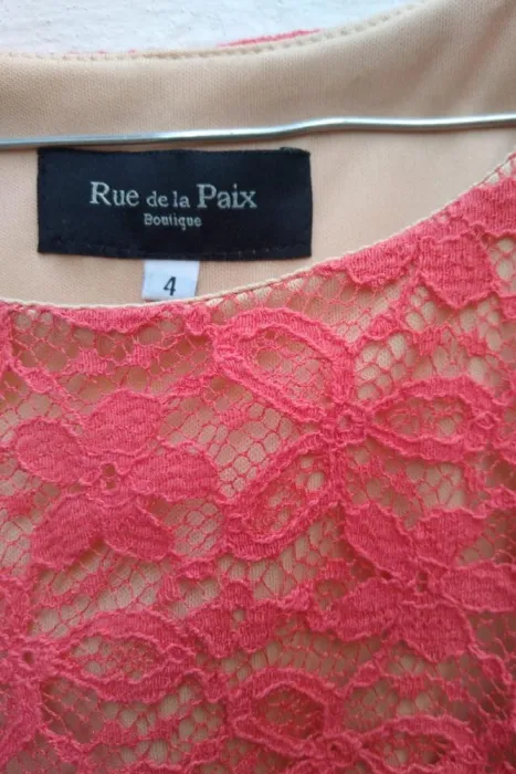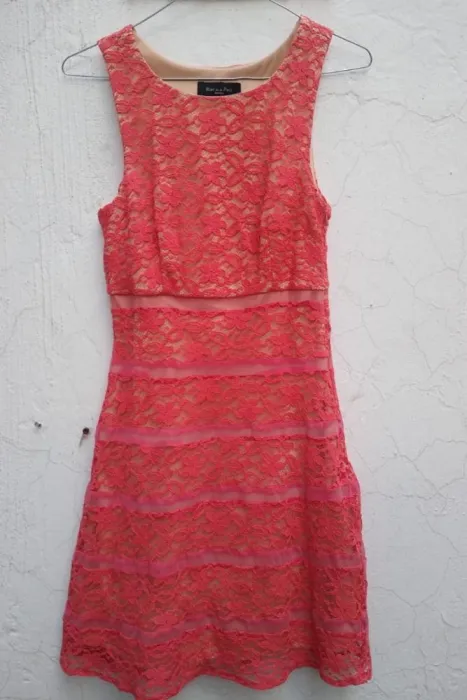 Vestido de día. Vestido sin mangas y hasta la rodilla con estampado de encaje de flores color salmón, tela de fondo color beige.