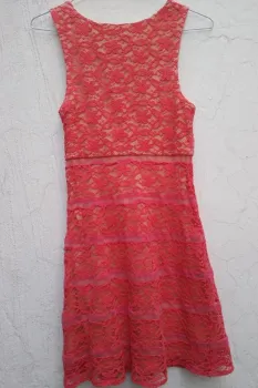Vestido sin mangas y hasta la rodilla con estampado de encaje de flores color salmón, tela de fondo color beige.