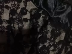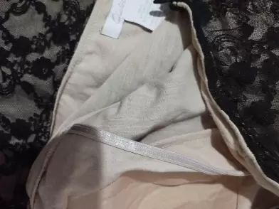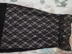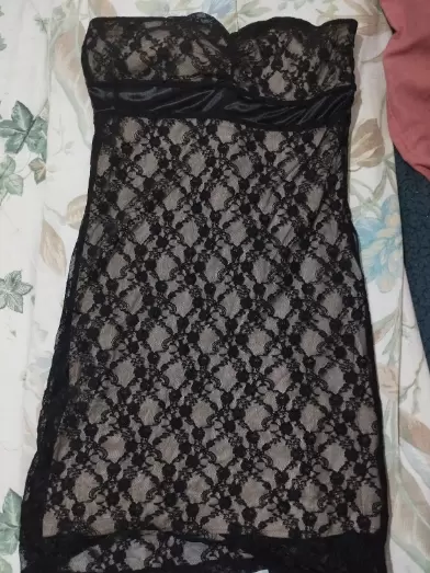 Vestido de encaje con fondo color carne muy sexy ; tiene un listón abajo del busto que resalta la figura y copas para más comodidad.Cuenta con zipper al costado , llega a la altura de la rodilla .