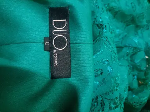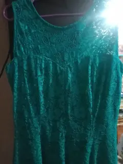 Talla grande, de encaje color turquesaIncluye fondo del mismo colorLargo a la rodilla!