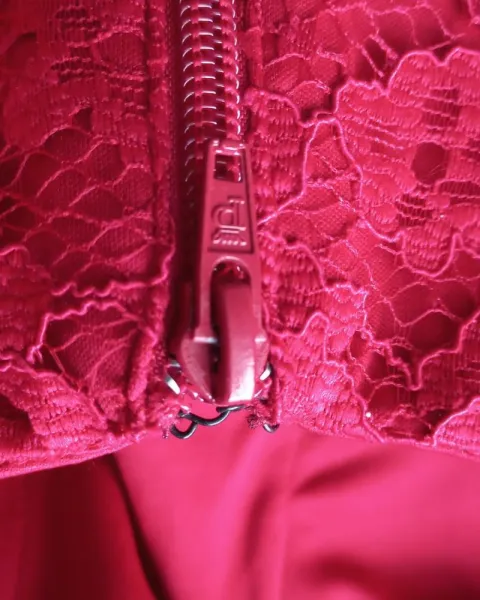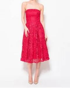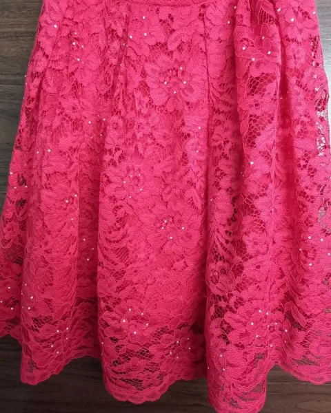 Vestido de encaje fiusha. Vestido color fiusha de encaje con brillos, sin tirantes tipo strapless solo se uso una vez, con cierre en la espalda